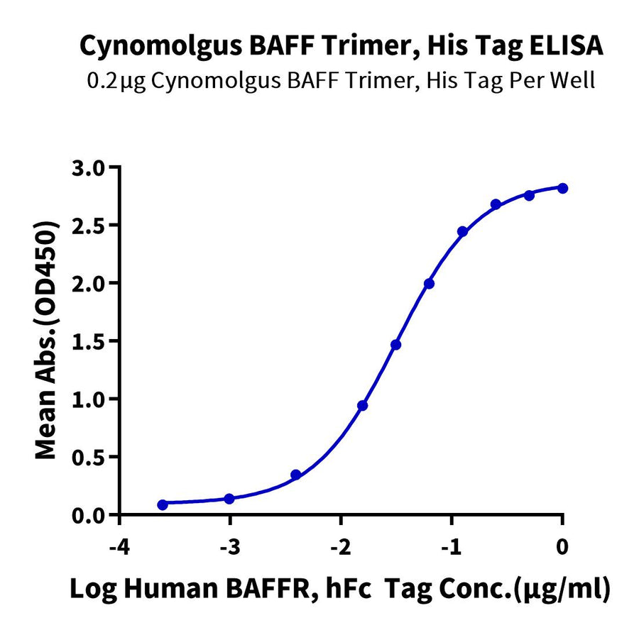 - Activity: Immobilized Cynomolgus BAFF Trimer, His Tag at 2ug/ml (100ul/Well) on the plate. Dose response curve for Human BAFFR, hFc Tag with the EC50 of 31.6ng/ml determined by ELISA.