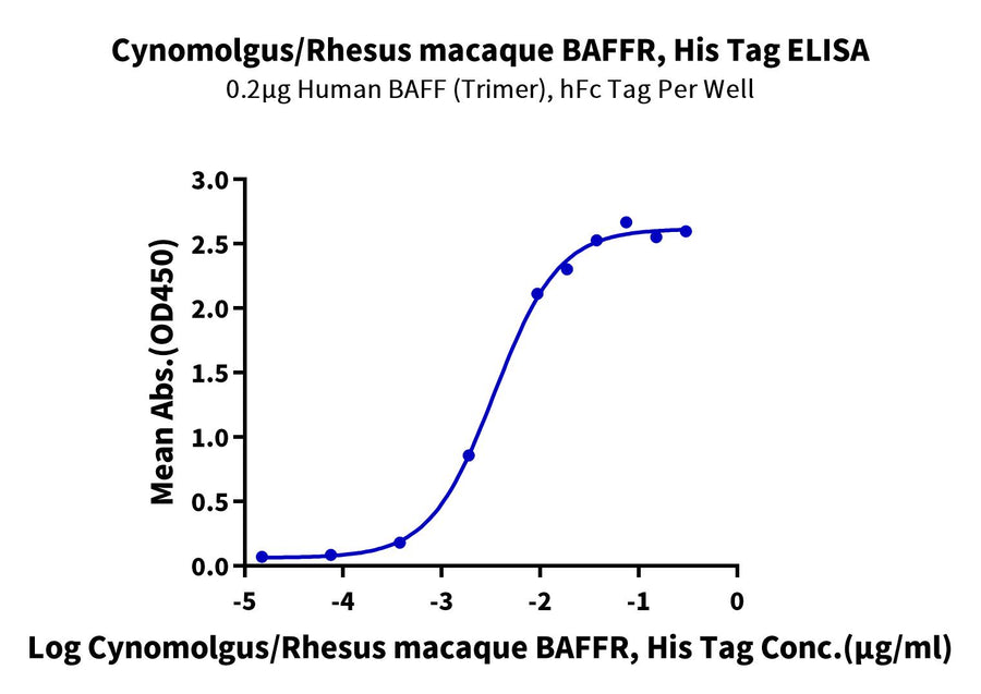 Immobilized Human BAFF (Trimer), hFc Tag at 2ug/ml (100ul/well) on the plate. Dose response curve for Cynomolgus/Rhesus macaque BAFFR, His Tag with the EC50 of 3.4ng/ml determined by ELISA. |