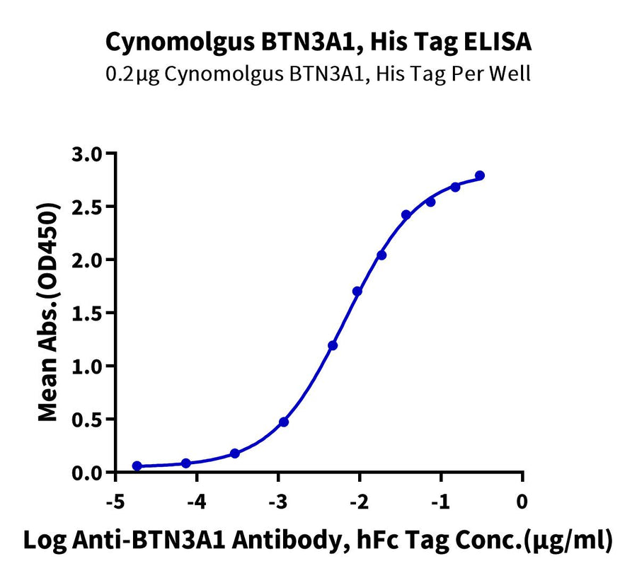 - Activity: Immobilized Cynomolgus BTN3A1, His Tag at 2ug/ml (100ul/Well) on the plate. Dose response curve for Anti-BTN3A1 Antibody, hFc Tag with the EC50 of 6.7ng/ml determined by ELISA.