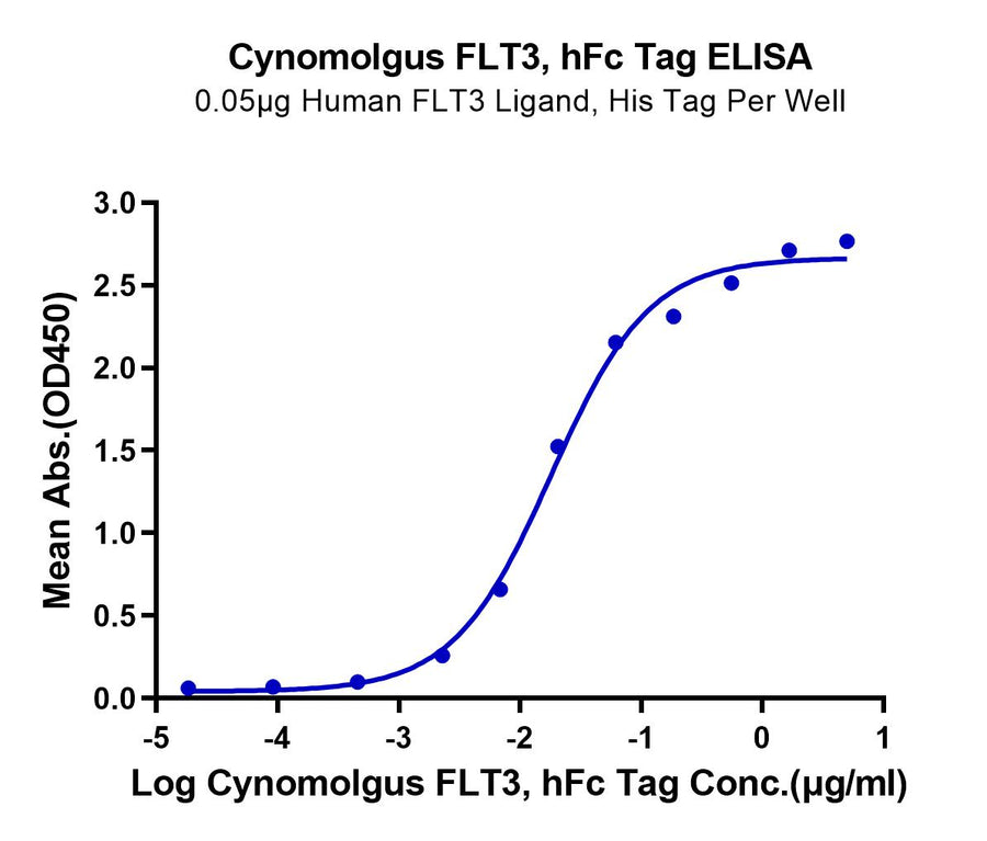- Activity: Immobilized Human FLT3 Ligand, His Tag at 0.5ug/ml (100ul/well) on the plate. Dose response curve for Cynomolgus FLT3, hFc Tag with the EC50 of 18.2ng/ml determined by ELISA.