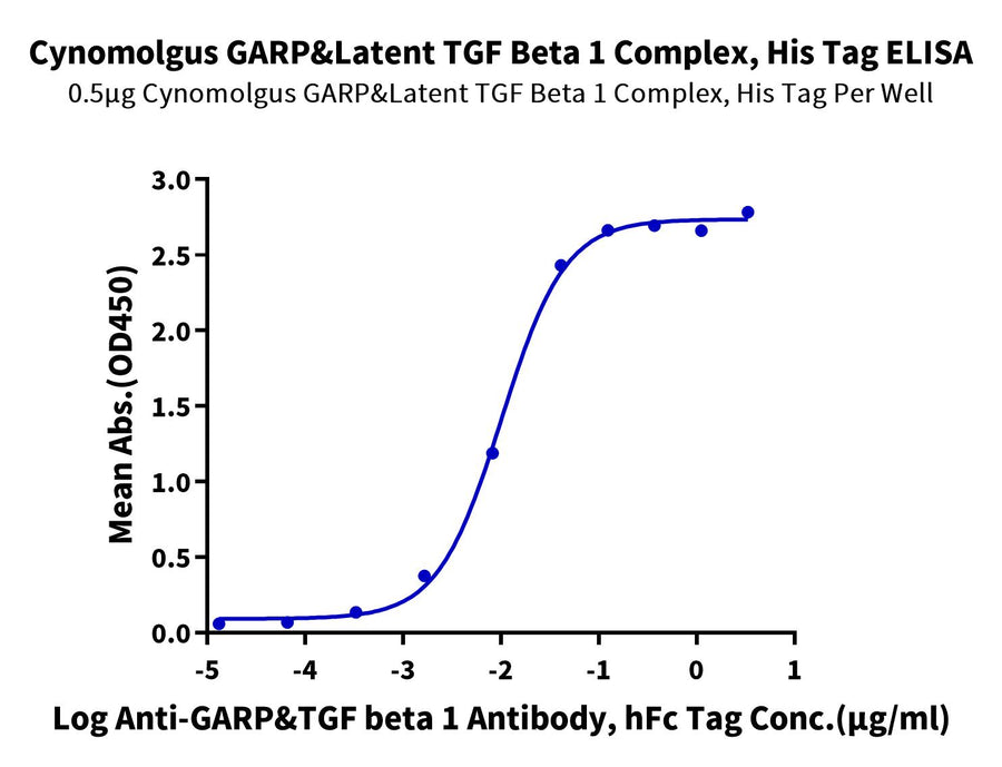 - Activity: Immobilized Cynomolgus GARP&Latent TGF beta 1 Complex, His Tag at 5ug/ml (100ul/Well) on the plate. Dose response curve for Anti-GARP&Latent TGF Beta 1 Antibody, hFc Tag with the EC50 of 10.1ng/ml determined by ELISA.