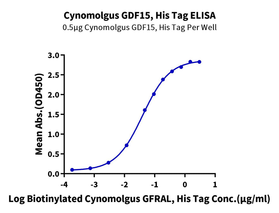 Immobilized Cynomolgus GDF15, His Tag at 5 ug/ml (100 ul/well) on the plate. Dose response curve for Biotinylated Cynomolgus GFRAL, His Tag with the EC50 of 39.9 ng/ml determined by ELISA (QC Test). |