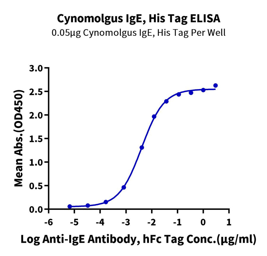 - Activity: Immobilized Cynomolgus IgE, His Tag at 0.5ug/ml (100ul/well) on the plate. Dose response curve for Omalizumab, hFc Tag with the EC50 of 5.3ng/ml determined by ELISA.