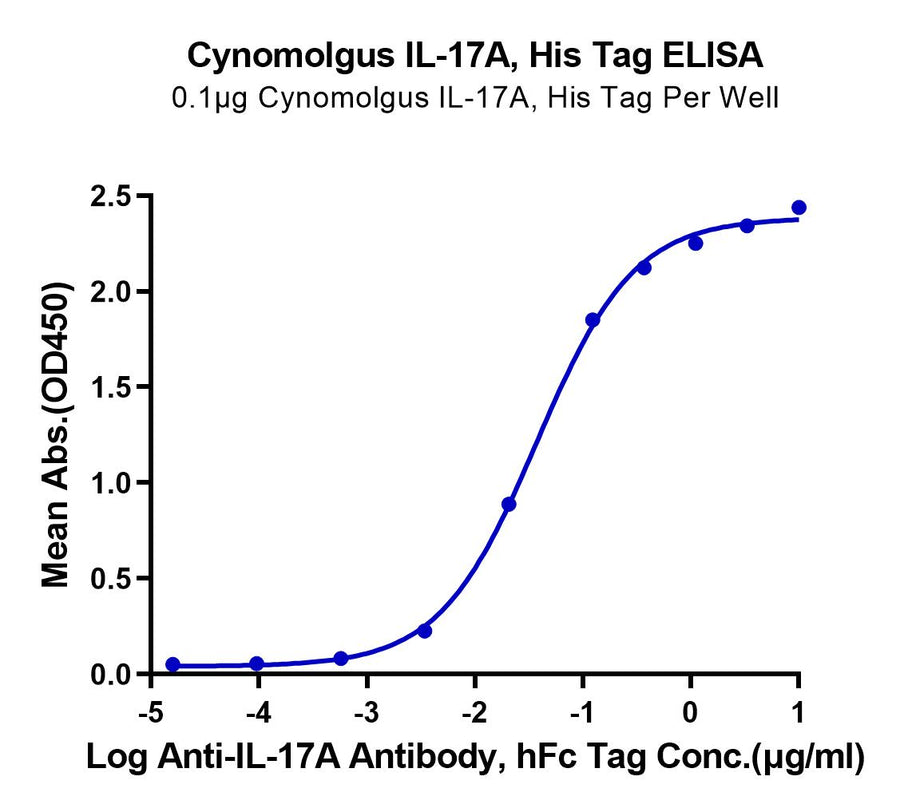 Immobilized Cynomolgus IL-17A, His Tag at 1ug/ml (100ul/well) on the plate. Dose response curve for Human IL-17R alpha, hFc Tag with the EC50 of 0.10ug/ml determined by ELISA. |