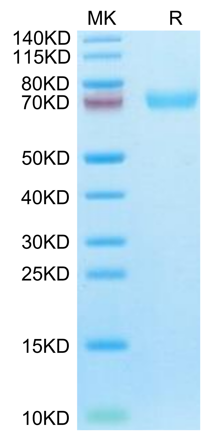 The protein has a predicted MW of 48.28 kDa. Due to glycosylation, the protein migrates to 68-75 kDa based on Bis-Tris PAGE result. |