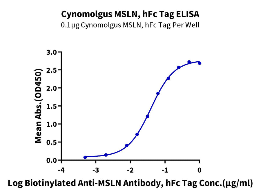 Immobilized Cynomolgus MSLN, hFc Tag at 1ug/ml (100ul/Well) on the plate. Dose response curve for Biotinylated Anti-MSLN Antibody, hFc Tag with the EC50 of 39.0ng/ml determined by ELISA (QC Test). |