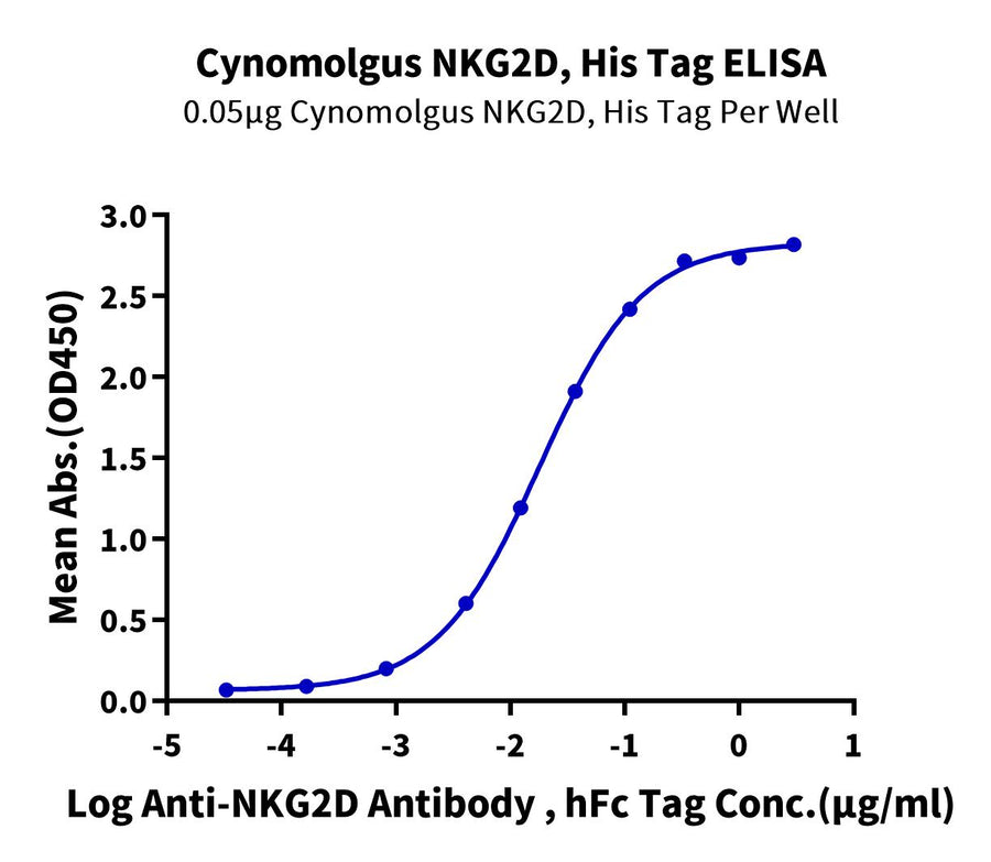 - Activity: Immobilized Cynomolgus NKG2D, His Tag at 0.5ug/ml (100ul/well) on the plate. Dose response curve for Anti-NKG2D Antibody, hFc Tag with the EC50 of 2.1ng/ml determined by ELISA.