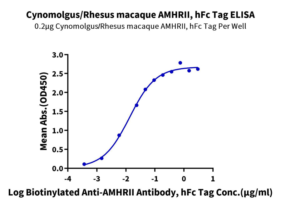 - Activity: Immobilized Cynomolgus/Rhesus macaque AMHRII, hFc Tag at 2ug/ml (100ul/well) on the plate. Dose response curve for Biotinylated Anti-AMHRII Antibody, hFc Tag with the EC50 of 13.4ng/ml determined by ELISA (QC Test).