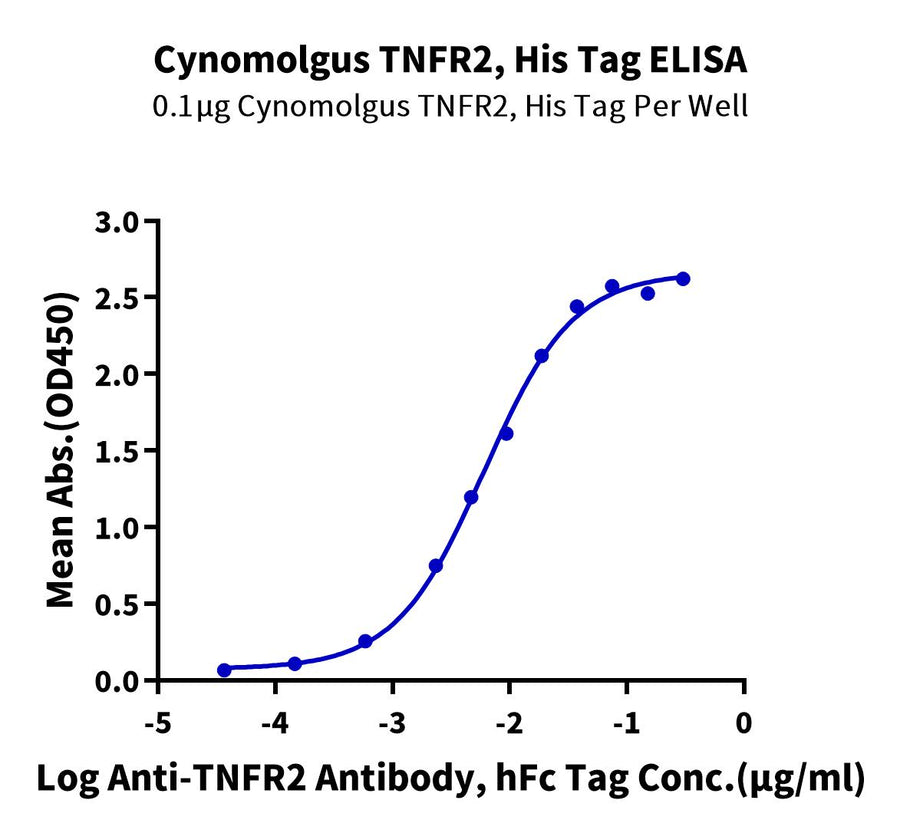 - Activity: Immobilized Cynomolgus TNFR2, His Tag at 1ug/ml (100ul/Well) on the plate. Dose response curve for Anti-TNFR2 Antibody, hFc Tag with the EC50 of 6.0ng/ml determined by ELISA (QC Test).
