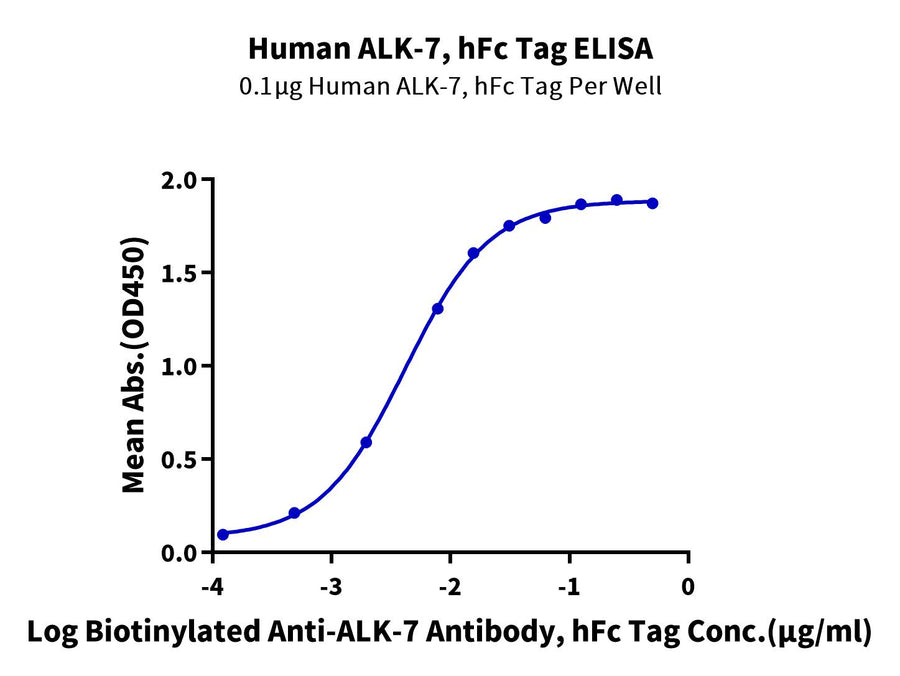 Immobilized Human ALK-7, hFc Tag at 1ug/ml (100ul/well) on the plate. Dose response curve for Biotinylated Anti-ALK-7 Antibody, hFc Tag with the EC50 of 4.1ng/ml determined by ELISA. |