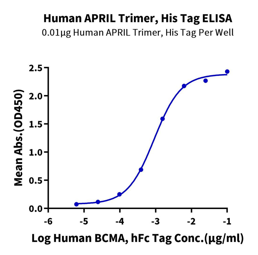 - Activity: Immobilized Human APRIL Trimer, His Tag at 0.1 ug/ml (100 ul/well) on the plate. Dose response curve for Human BCMA, hFc Tag with the EC50 of 0.9 ng/ml determined by ELISA (QC Test).