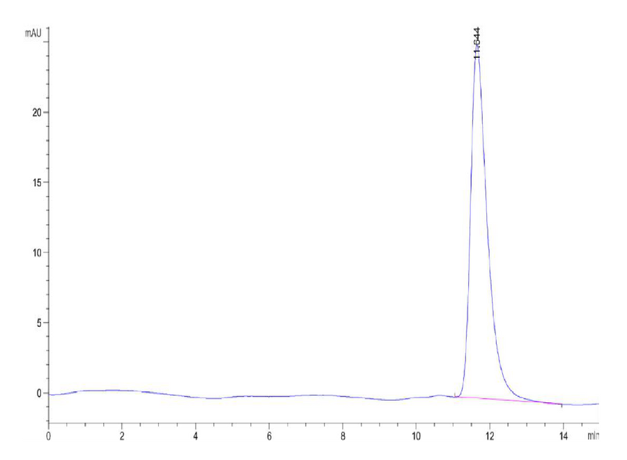 The protein has a predicted MW of 36.52 kDa. Due to glycosylation, the protein migrates to 50-60 kDa based on Bis-Tris PAGE result. |