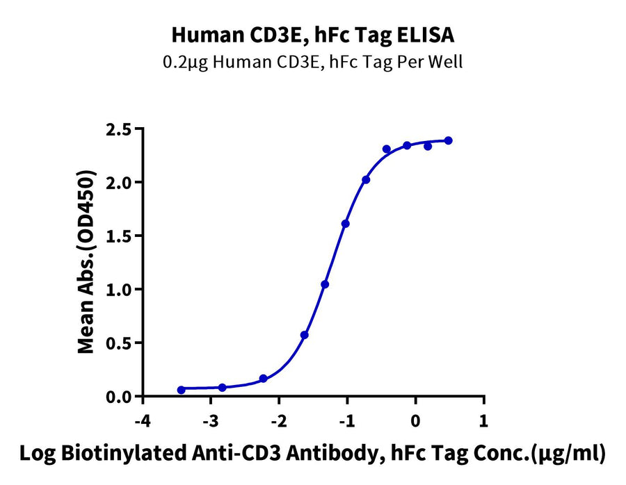 Immobilized Human CD3E, hFc Tag at 2 ug/ml (100 ul/Well) on the plate. Dose response curve for Biotinylated Anti-CD3 Antibody, hFc Tag with the EC50 of 58.3ng/ml determined by ELISA (QC Test). |