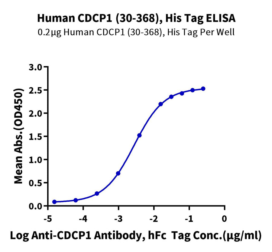 - Activity: Immobilized Human CDCP1 ATF (30-368), His Tag at 2ug/ml (100ul/well) on the plate. Dose response curve for Anti-CDCP1 Antibody, hFc Tag with the EC50 of 2.8ng/ml determined by ELISA.