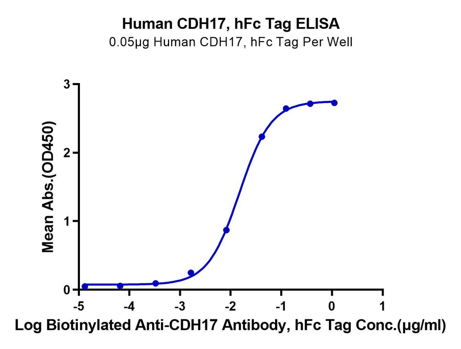 - Activity: Immobilized Human CDH17, hFc Tag at 0.5ug/ml (100ul/well) on the plate. Dose response curve for Biotinylated Anti-CDH17 Antibody, hFc Tag with the EC50 of 15.1ng/ml determined by ELISA.