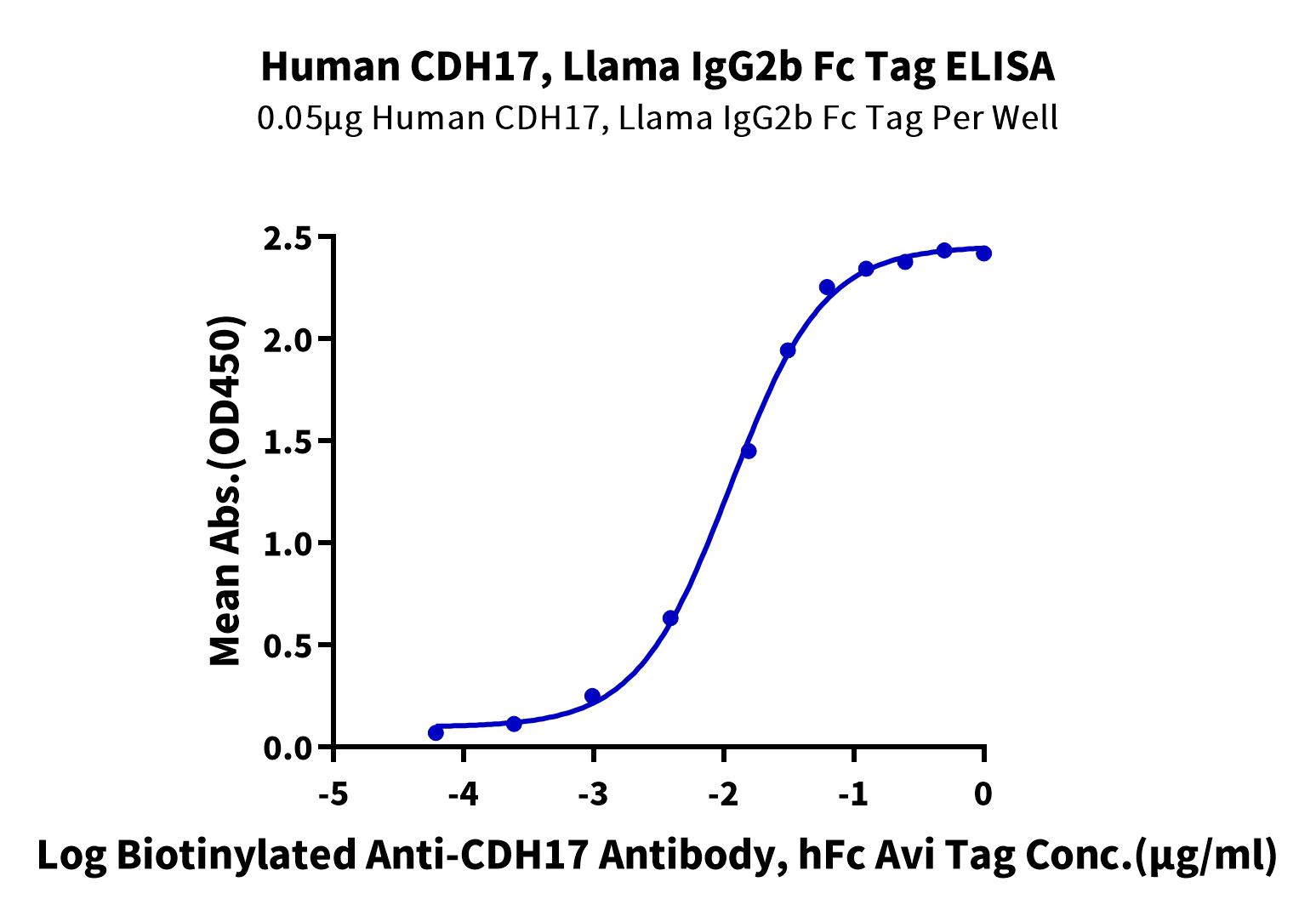 Immobilized Human CDH17, Llama IgG2b Fc Tag at 0.5ug/ml (100ul/well) on the plate. Dose response curve for Biotinylated Anti-CDH17 Antibody, hFc Avi Tag with the EC50 of 11.2ng/ml determined by ELISA. |