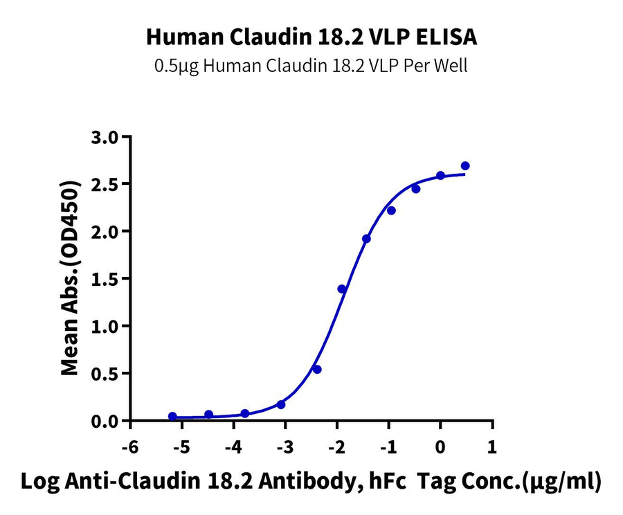 - Activity: Immobilized Human Claudin 18.2 VLP at 5ug/ml (100 ul/Well) on the plate. Dose response curve for Anti-Claudin 18.2 Antibody, hFc Tag with the EC50 of 11.0 ng/ml determined by ELISA (QC Test).