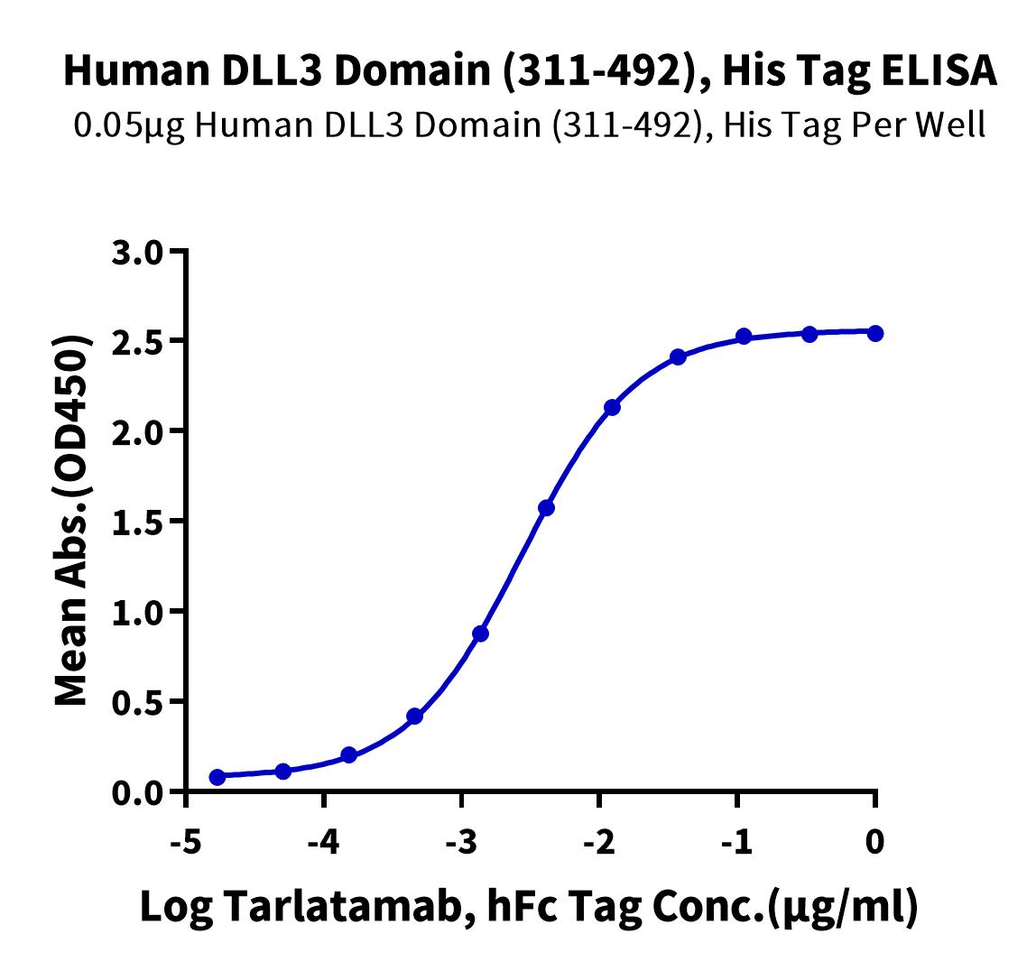 Immobilized Human DLL3 Domain (311-492), His Tag at 0.5ug/ml (100ul/well) on the plate. Dose response curve for Anti-DLL3 Antibody, hFc Tag with the EC50 of 3.2ng/ml determined by ELISA. |