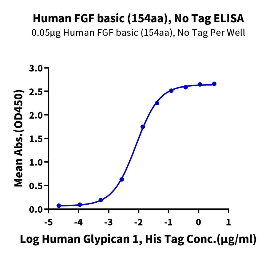 - Activity: Immobilized Human FGF basic (154aa) at 0.5ug/ml (100ul/well) on the plate. Dose response curve for Human Glypican 1, His Tag with the EC50 of 8.2ng/ml determined by ELISA (QC Test).