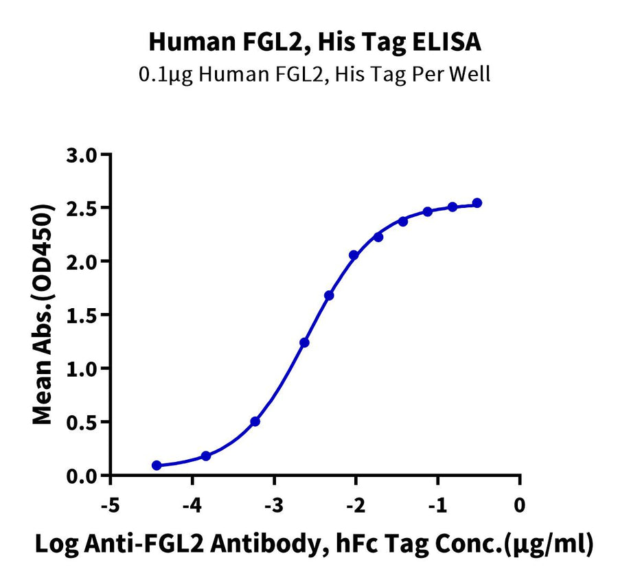 - Activity: Immobilized Human FGL2, His Tag at 1ug/ml (100ul/well) on the plate. Dose response curve for Anti-FGL2 Antibody, hFc Tag with the EC50 of 2.5ng/ml determined by ELISA.