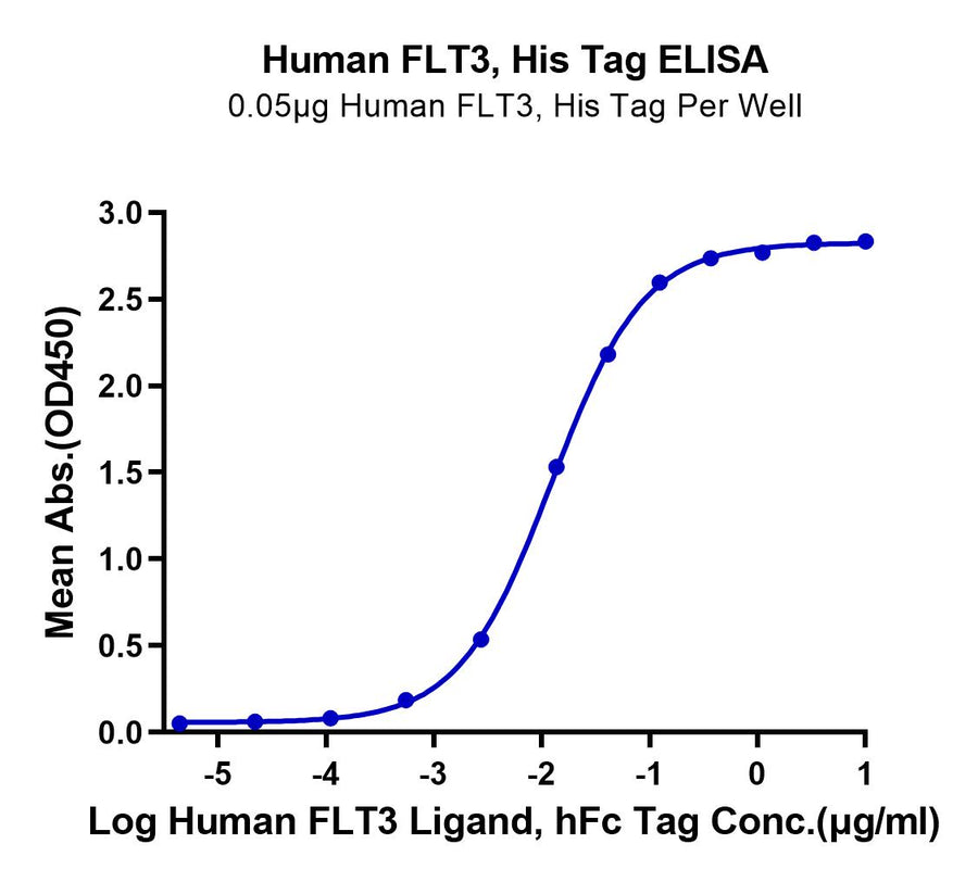 Immobilized Human FLT3, His Tag at 5ug/ml (100ul/well) on the plate. Dose response curve for Human FLT3 Ligand, hFc Tag with the EC50 of 35.7ng/ml determined by ELISA. |