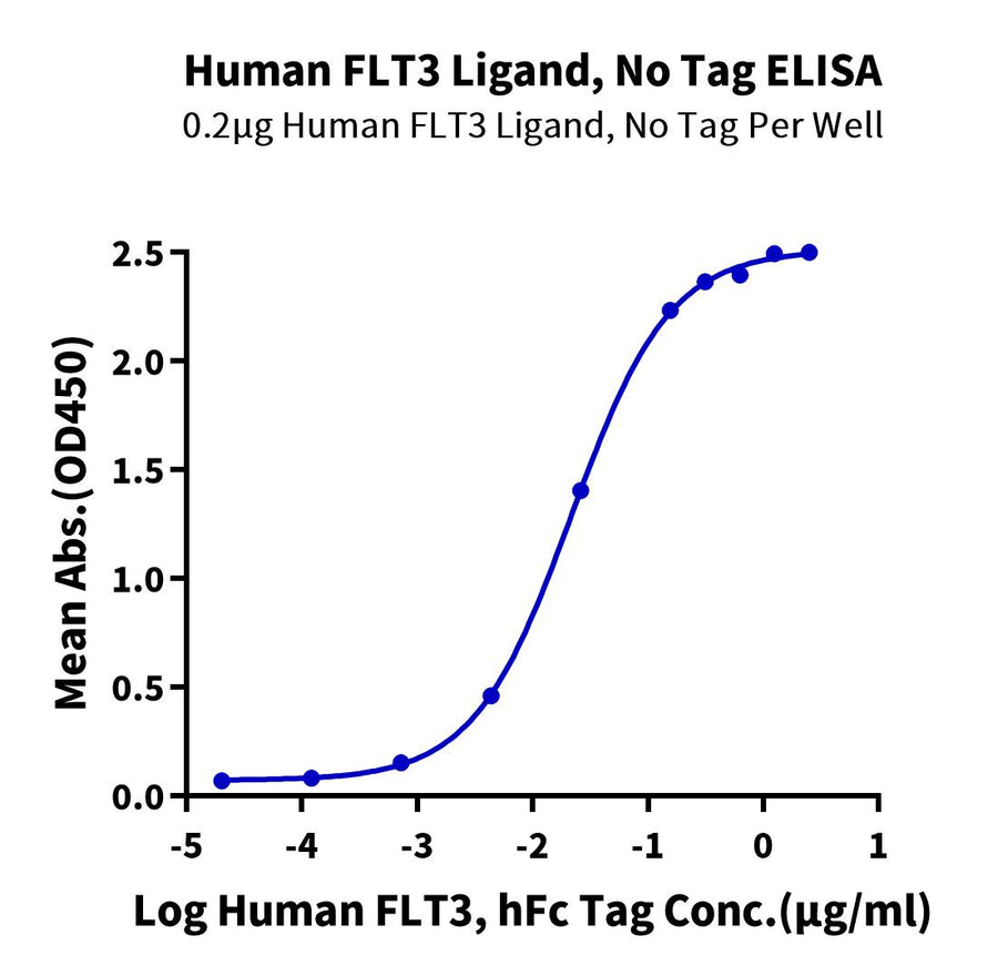 Immobilized Human FLT3 Ligand, No Tag at 2ug/ml (100ul/well) on the plate. Dose response curve for Human FLT3, hFc Tag with the EC50 of 21.7ng/ml determined by ELISA. |