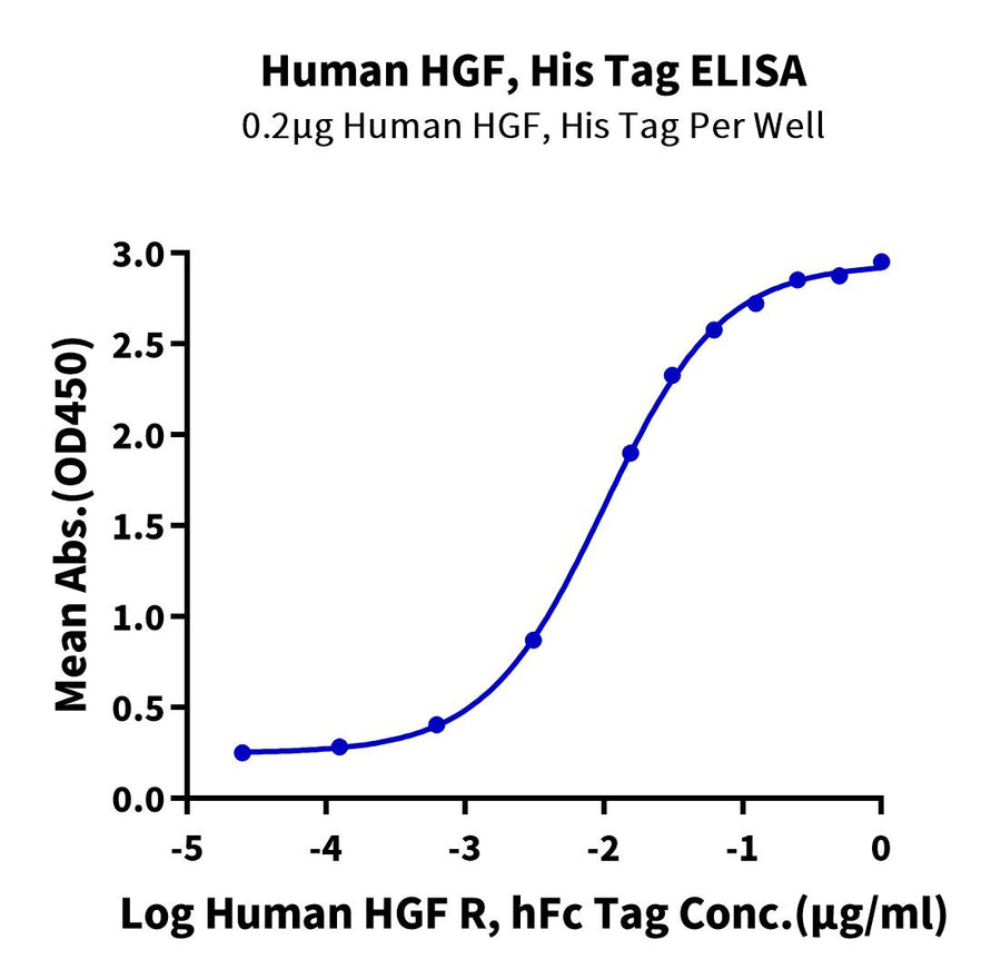 - Activity: Immobilized Human HGF, His Tag at 2ug/ml (100ul/Well) on the plate. Dose response curve for Human HGF R, hFc Tag with the EC50 of 9.9ng/ml determined by ELISA.