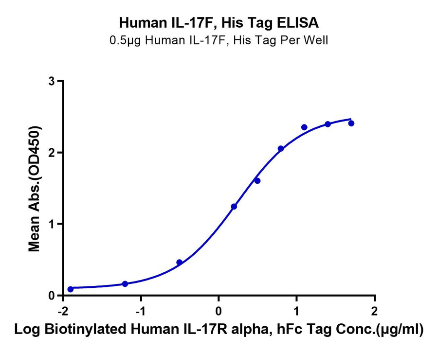 Immobilized Human IL-17F, His Tag at 5ug/ml (100ul/well) on the plate. Dose response curve for Human IL-17 R alpha, hFc Tag with the EC50 of 1.75ug/ml determined by ELISA (QC Test). |