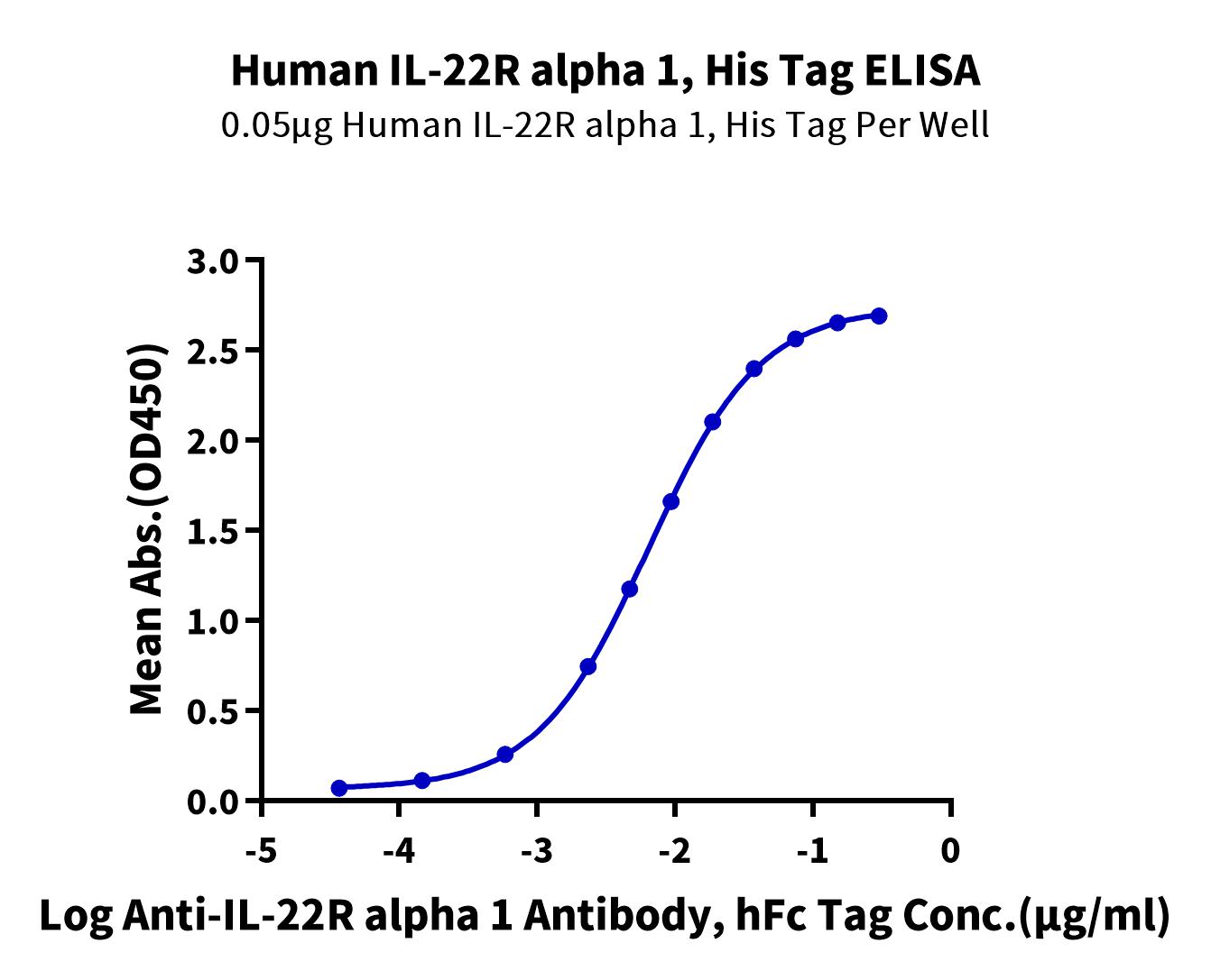 Immobilized Human IL-22R alpha 1, His Tag at 0.5ug/ml (100ul/well) on the plate. Dose response curve for Anti-IL-22R alpha 1 Antibody, hFc Tag with the EC50 of 6.4ng/ml determined by ELISA (QC Test). |