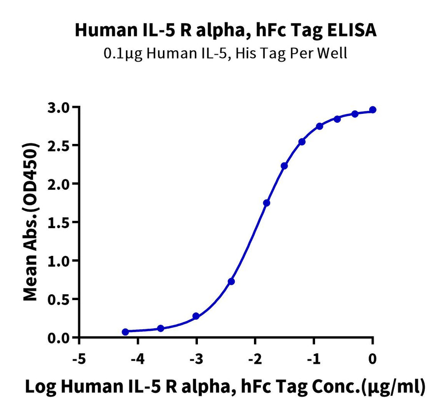 Immobilized Human IL-5, His Tag at 1ug/ml (100ul/Well) on the plate. Dose response curve for Human IL-5 R alpha, hFc Tag with the EC50 of 11.7ng/ml determined by ELISA. |