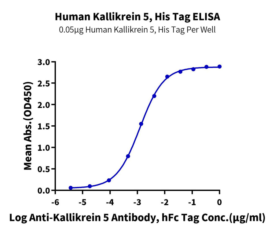 Immobilized Human Kallikrein 5, His Tag at 0.5ug/ml (100ul/Well) on the plate. Dose response curve for Anti-Kallikrein 5 Antibody, hFc Tag with the EC50 of 3.7ng/ml determined by ELISA (QC Test). See testing image for detail.Measured by its ability to cleave the fluorogenic peptide substrate Boc-VPR-AMC. The specific activity is >400 pmol/min/µg (QC Test). |