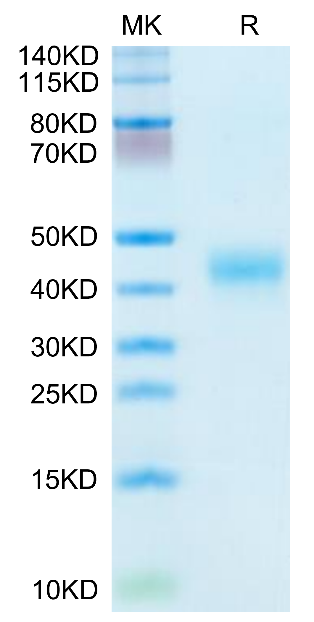 The protein has a predicted MW of 30.7 kDa. Due to glycosylation, the protein migrates to 42-48 kDa based on Bis-Tris PAGE result. |
