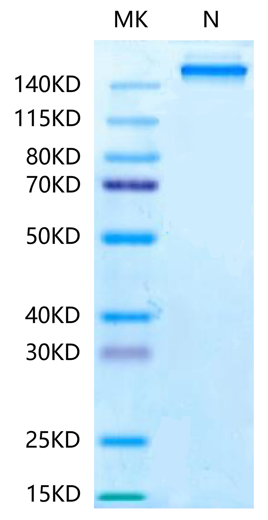 The protein has a predicted MW of 258 kDa. Due to glycosylation, the protein migrates to 260-265 kDa under Non reduced (N) condition based on Bis-Tris PAGE result. |