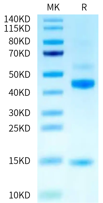 The protein has a predicted MW of 13.0 kDa (mature form) and 32.0 kDa (pro form). Due to glycosylation and interchain disulfide bond, the protein migrates to 15 kDa (mature form) and 40-50 kDa (pro form) under reduced (R) condition based on Bis-Tris PAGE result. |
