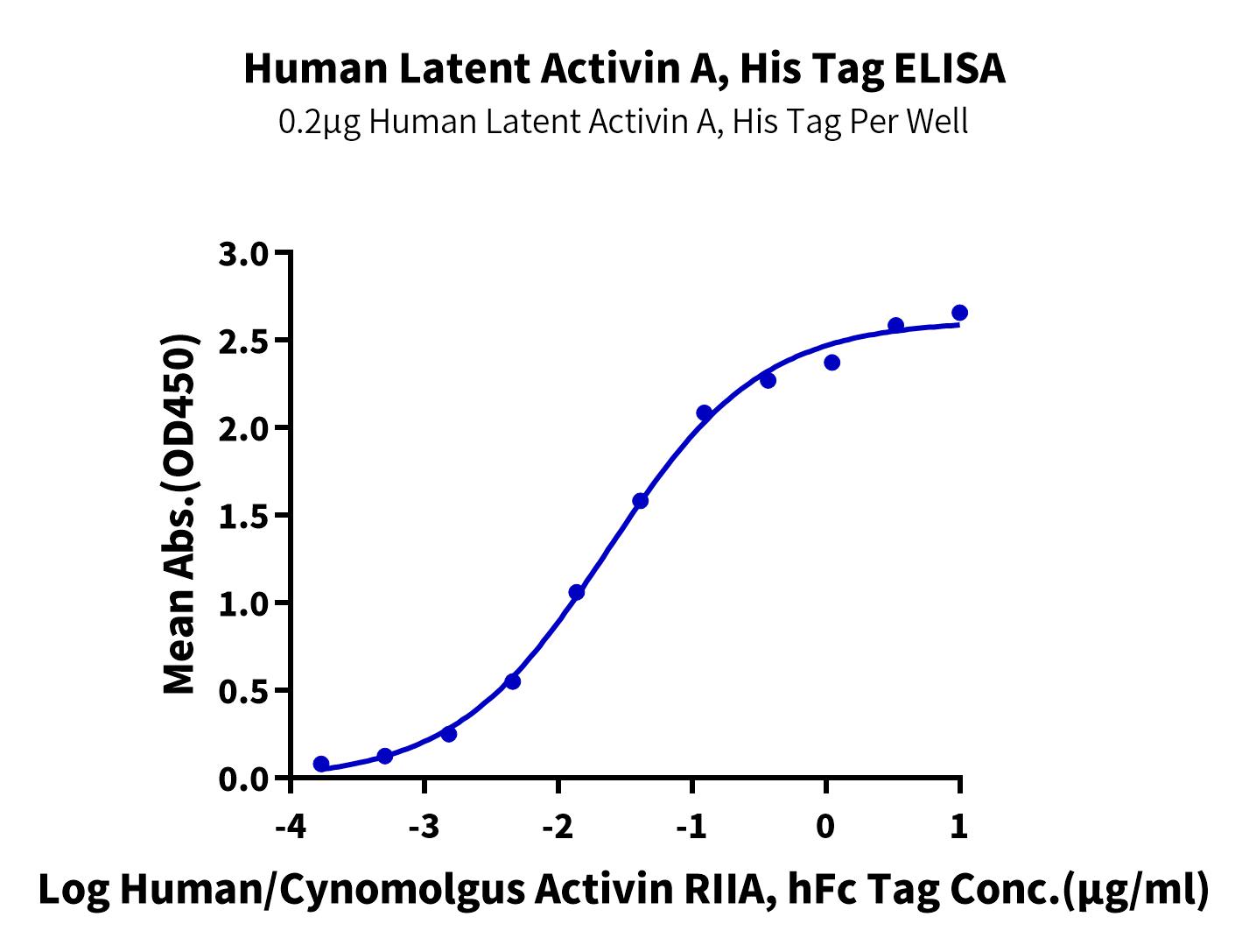 - Activity: Immobilized Human Latent Activin A, His Tag at 1ug/ml (100ul/well) on the plate. Dose response curve for Human/Cynomolgus Activin RIIB, hFc Tag with the EC50 of 16.6ng/ml determined by ELISA.