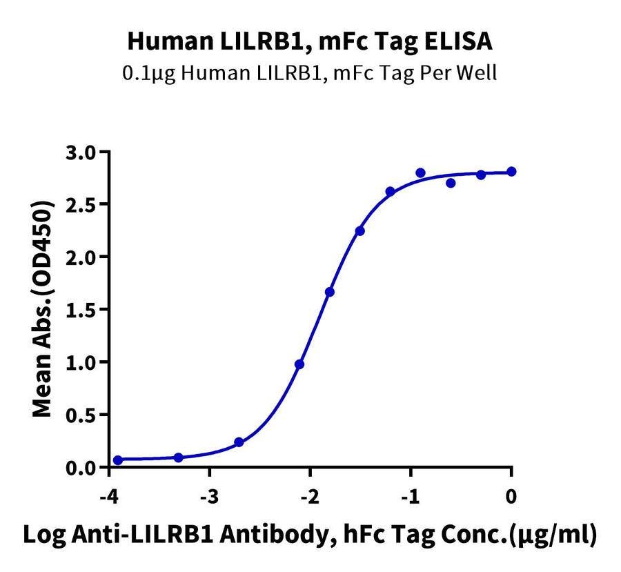 - Activity: Immobilized Human LILRB1, mFc Tag at 1ug/ml (100ul/well) on the plate. Dose response curve for Anti-LILRB1 Antibody, hFc Tag with the EC50 of 12.5ng/ml determined by ELISA (QC Test).