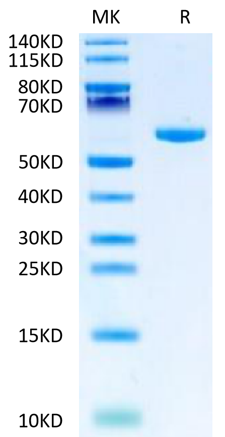 The protein has a predicted MW of 50.58 kDa. Due to glycosylation, the protein migrates to 53-63 kDa based on Bis-Tris PAGE result. |