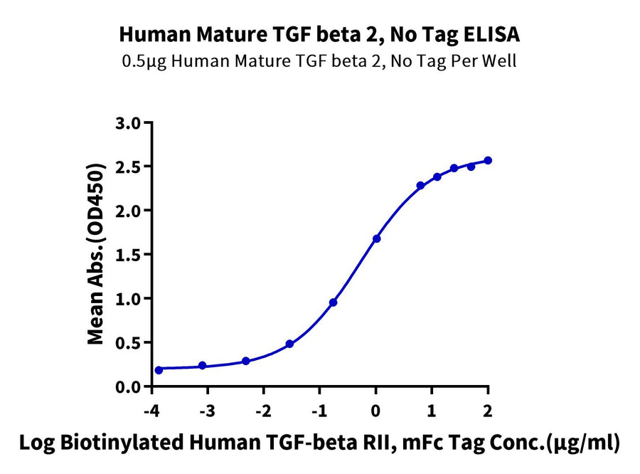 Immobilized Human Mature TGF beta 2, No Tag at 5ug/ml (100ul/Well) on the plate. Dose response curve for Biotinylated Human TGF-beta RII, mFc Tag with the EC50 of 0.53ug/ml determined by ELISA (QC Test). |