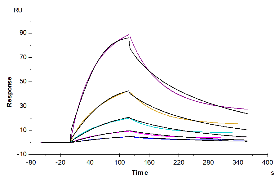 Immobilized Human NKG2D, His Tag at 5ug/ml (100ul/Well) on the plate. Dose response curve for Human MICA, hFc Tag with the EC50 of 3.2ng/ml determined by ELISA (QC Test). The affinity constant of 0.36 uM as determined in SPR assay (Biacore T200). |