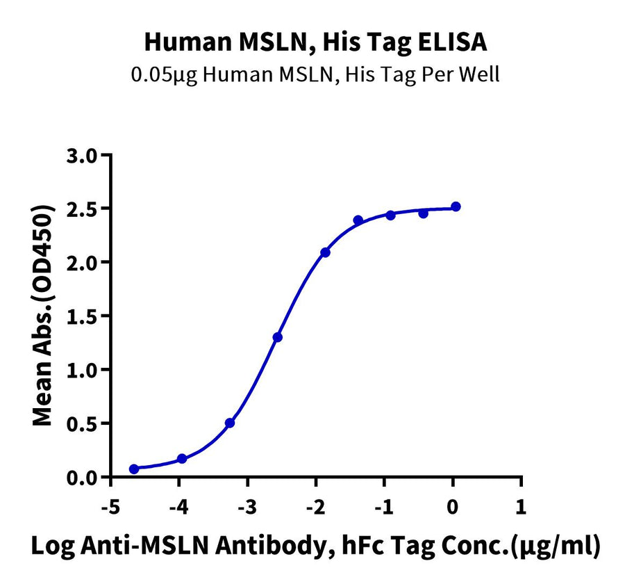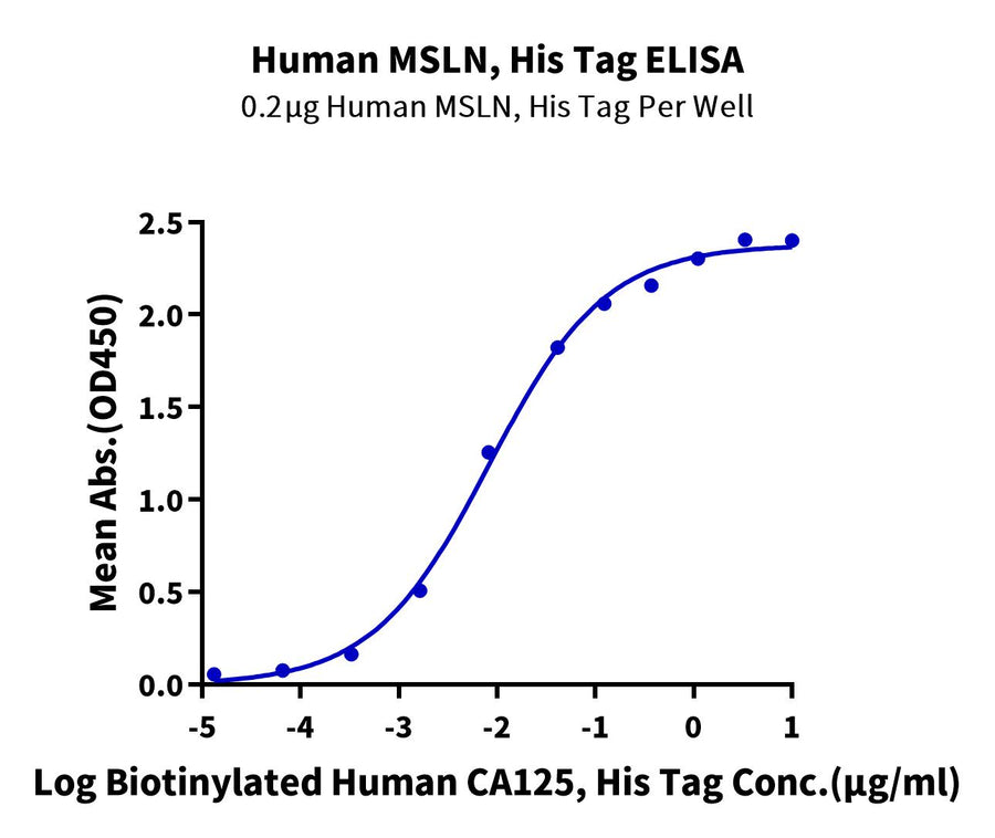 - Activity: Immobilized Human MSLN, His Tag at 2ug/ml (100ul/well) on the plate. Dose response curve for Biotinylated Human CA125, His Tag with the EC50 of 8.3ng/ml determined by ELISA (QC Test).