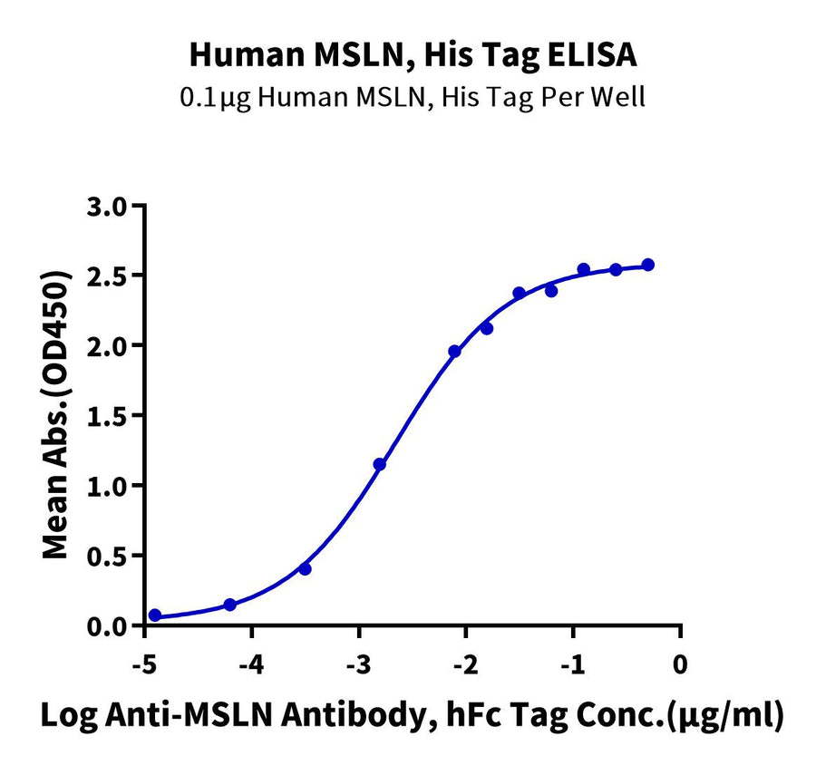- Activity: Immobilized Human MSLN, His Tag at 1ug/ml (100ul/well) on the plate. Dose response curve for Anti-MSLN Antibody, hFc Tag with the EC50 of 2.2ng/ml determined by ELISA (QC Test).