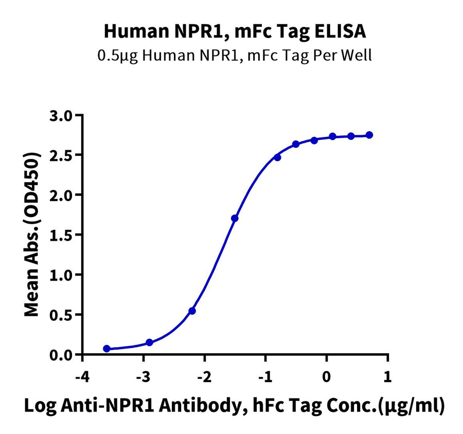 - Activity: Immobilized Human NPR1, mFc Tag at 5ug/ml (100ul/well) on the plate. Dose response curve for Anti-NPR1 Antibody, hFc Tag with the EC50 of 43.2ng/ml determined by ELISA (QC Test).