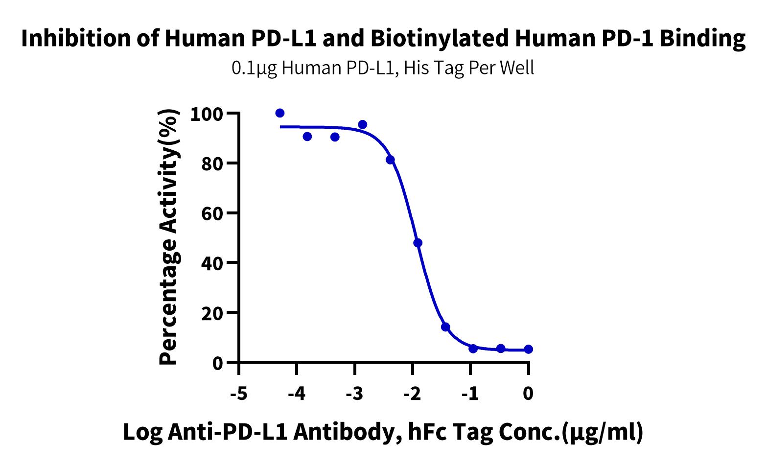 - Activity: Immobilized Human PD-L1, His Tag at 1ug/ml (100ul/well) on the plate. Dose response curve for Anti-PD-L1 Antibody, hFc Tag with the EC50 of 0.92ng/ml determined by ELISA. The affinity constant of 0.25 µM as determined in SPR assay (Biacore T200).