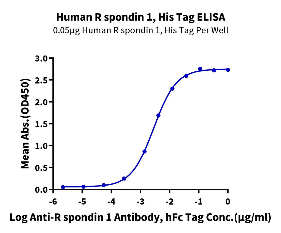 - Activity: Immobilized Human R spondin 1, His Tag at 0.5ug/ml (100ul/well) on the plate. Dose response curve for Anti-R spondin 1 Antibody, hFc Tag with the EC50 of 2.9ng/ml determined by ELISA (QC Test).