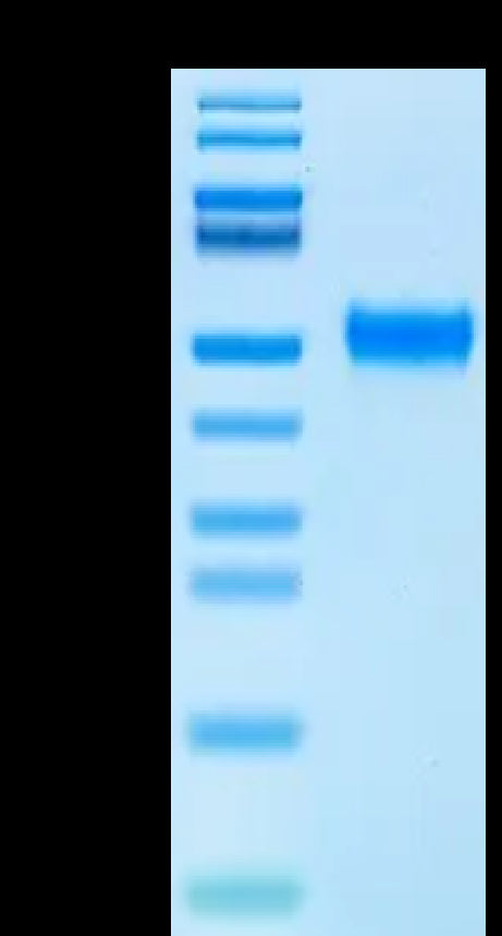 The protein has a predicted MW of 38.2 kDa. Due to glycosylation, the protein migrates to 48-58 kDa based on Bis-Tris PAGE result. |