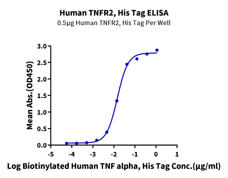 - Activity: Immobilized Human TNFR2, His Tag at 5ug/ml (100ul/Well). Dose response curve for Biotinylated Human TNF alpha, His Tag with the EC50 of 14.6ng/ml determined by ELISA (QC Test).