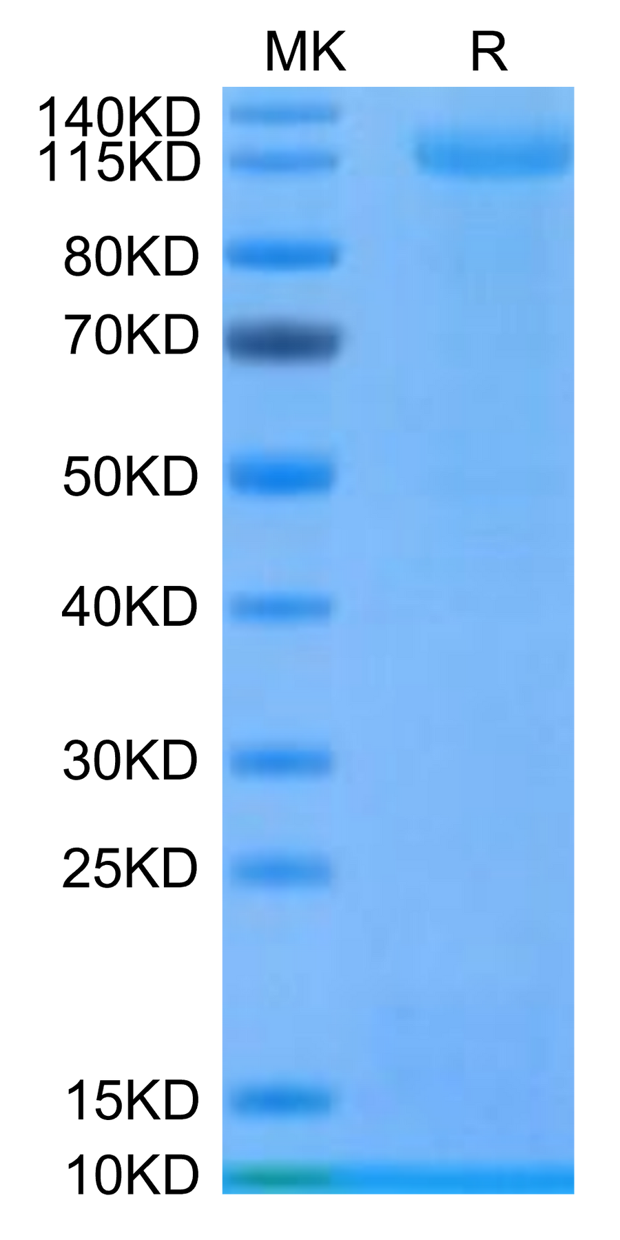 The protein has a predicted MW of 101.11 kDa. Due to glycosylation, the protein migrates to 115-125 kDa based on Bis-Tris PAGE result. |