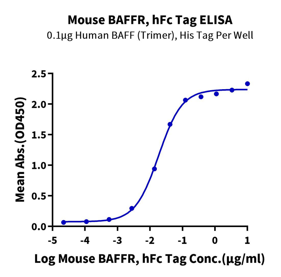 - Activity: Immobilized Human BAFF (Trimer), His Tag at 1ug/ml (100ul/well) on the plate. Dose response curve for Mouse BAFFR, hFc Tag with the EC50 of 18.4ng/ml determined by ELISA (QC test).