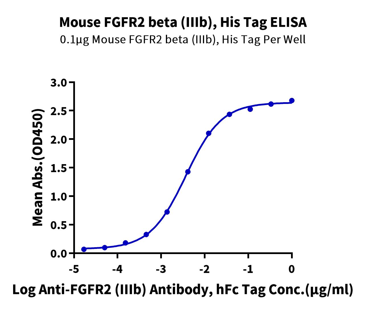 - Activity: Immobilized Mouse FGFR2 beta (IIIb), His Tag at 1ug/ml (100ul/well) on the plate. Dose response curve for Anti-FGFR2 (IIIb) Antibody, hFc Tag with the EC50 of 3.7ng/ml determined by ELISA.