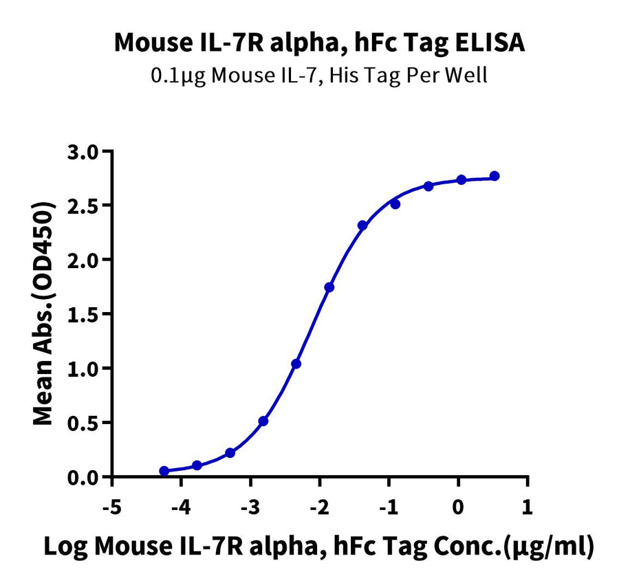 Immobilized Mouse IL-7, His Tag at 1ug/ml (100ul/well) on the plate. Dose response curve for Mouse IL-7R alpha, hFc Tag with the EC50 of 7.9ng/ml determined by ELISA. |